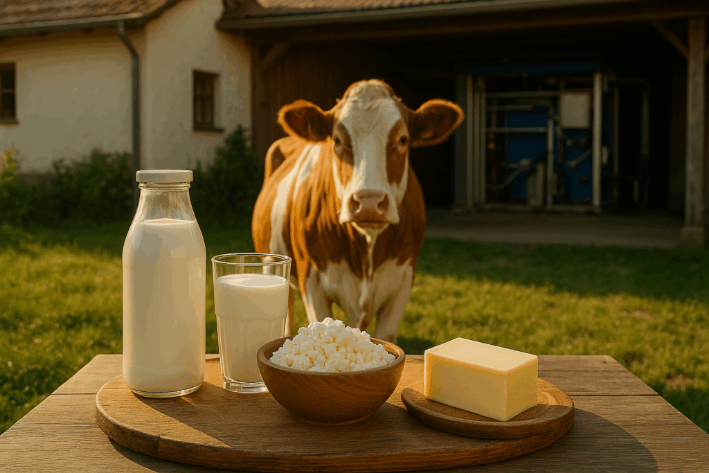 Im Jahr 2022 haben wir uns dazu entschieden, dass wir in die Milchverarbeitung einsteigen möchten, um regionale und hoch qualitative Milchprodukte herzustellen. Nach einer intensiven Planungsphase bzw. verschiedenen Kursen, Weiterbildungen und Betriebsbesichtigungen wurde im Jahr 2023 eine Hofmolkerei nach heutigen Hygiene- und Qualitätsstandards gebaut, die mit verschiedenen Milchverarbeitungsgeräten und moderner Einrichtung ausgestattet ist. 2025 begann die Produktion mit Vollmilch und Joghurt. Nach und nach kamen neue Produkte, wie Butter, Topfen, Aufstriche sowie verschiedene Drinks hinzu. Neue Produktideen werden laufend ausprobiert und weiterentwickelt. Durch die Hofmolkerei wird unser bäuerlicher Familienbetrieb um ein weiteres Standbein ergänzt und zusätzlich werden neue Arbeitsplätze geschaffen. Wir möchten uns durch eigene Preisgestaltung und regionale Vermarktung gut am Markt platzieren und unseren Kund:innen und Vermarktungspartner:innen ein zuverlässiger und fairer Partner sein.